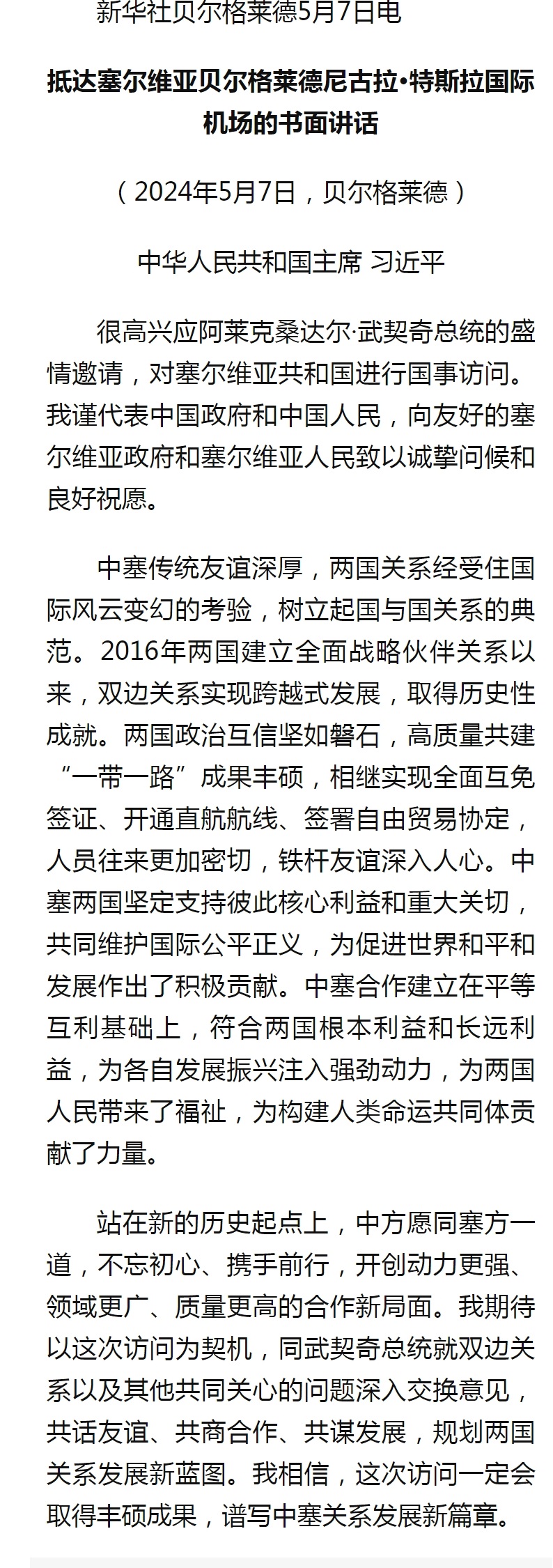 习近平抵达塞尔维亚贝尔格莱德尼古拉·特斯拉国际机场发表书面讲话