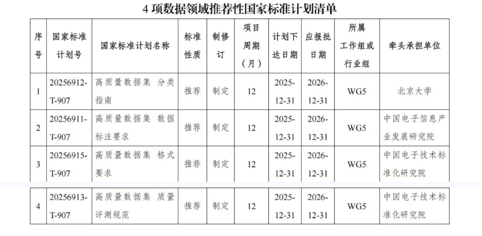 近日,国家标准化管理委员会下达2025年第十二批推荐性国家标准计划,其中,高质量数据集分类指南、数据标注要求、格式要求及质量评测规范等4项推荐性国家标准计划由全国数据标准化技术委员会归口管理。